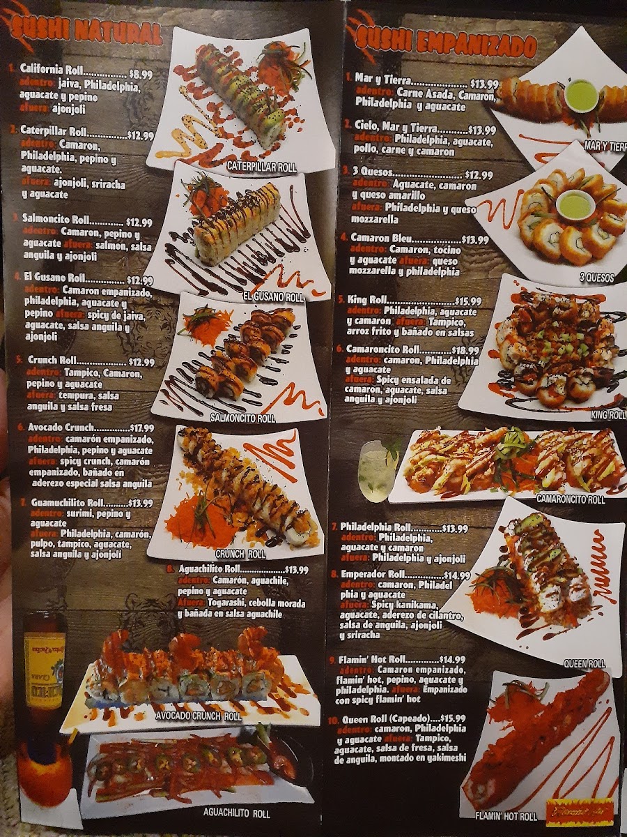 adentro: Camaron Empanizado, Philadelphia, aguacate y pepino. afuera spicy de jaiva, aguacate, salsa anguila y ajonjoli.
