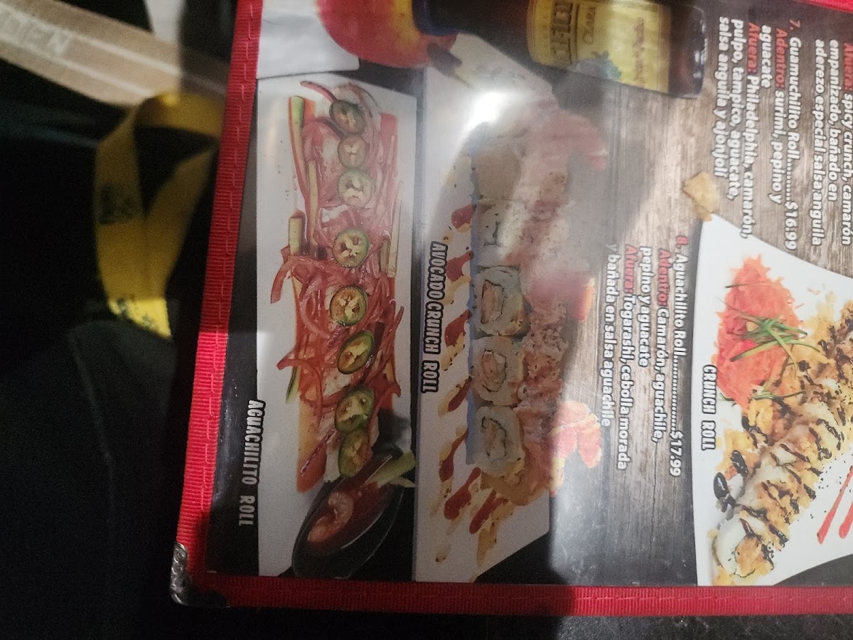 Adentro: aguacate y camaron. Afmers: Philadelphia, tampico, spicy de camaron y queso gratinado.
